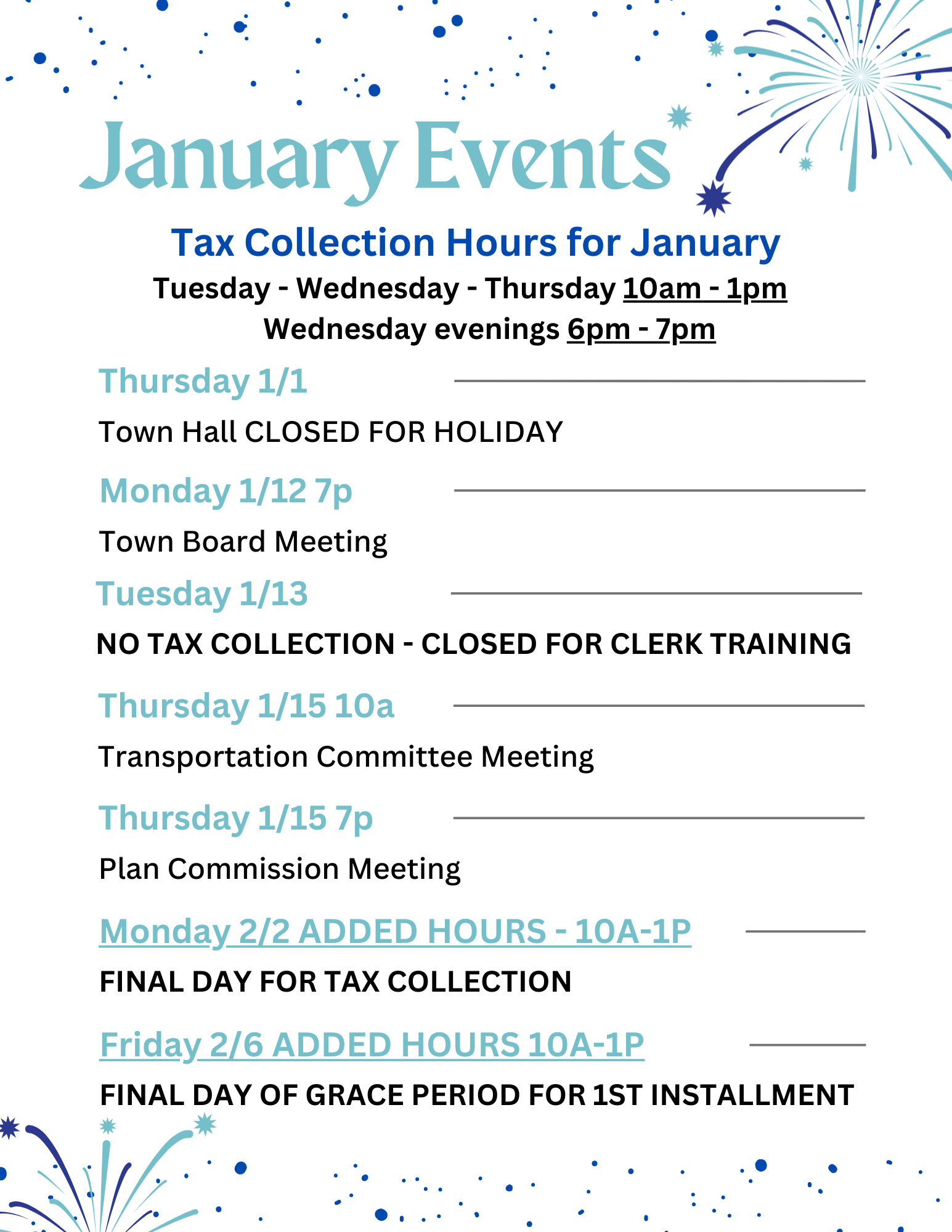 Please take note of all happenings during the month of January. Hours for tax collection are listed (subject to change), please check the website for any unexpected closures.